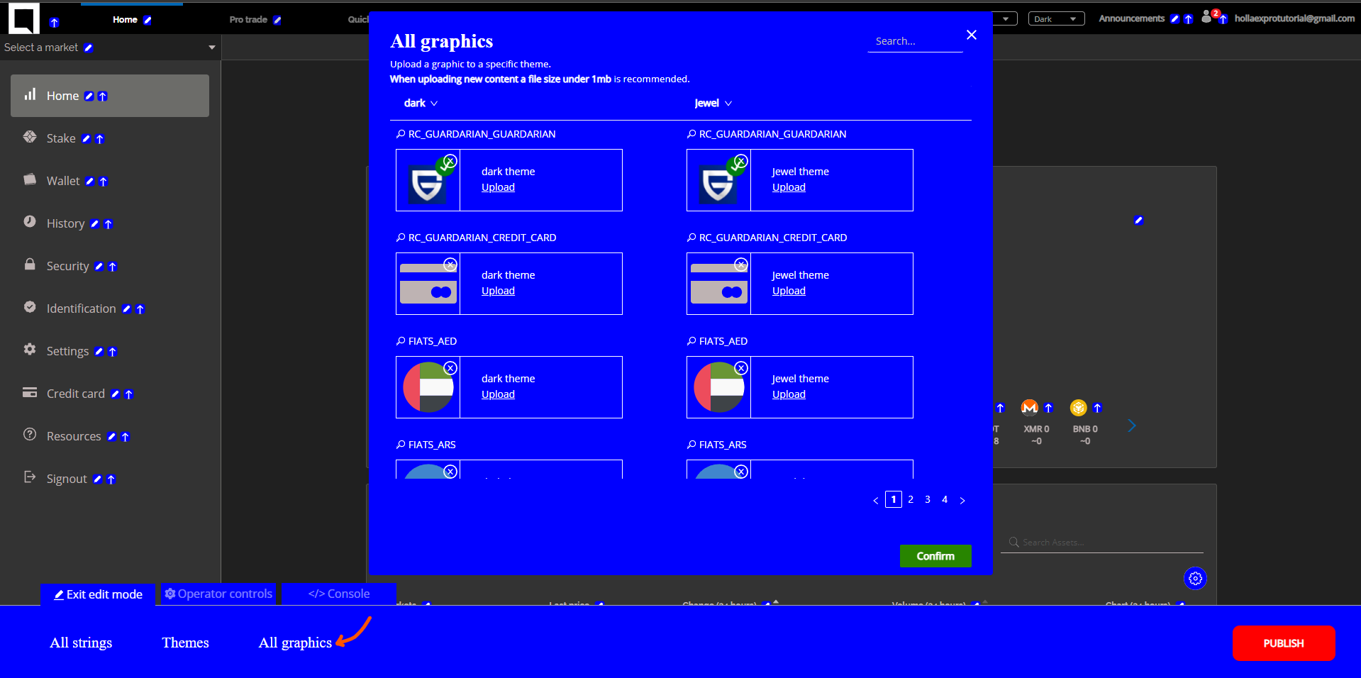 The quickest way to make significant changes to your exchange is by using the Enter Edit Mode button on the bottom left of the screen on the admin account.