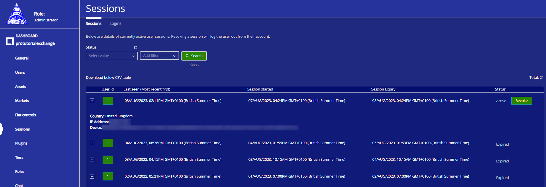 Status - Whether a session is active or expired. The operator has the power to revoke a session and log out of the account and set the session to 'expired'.