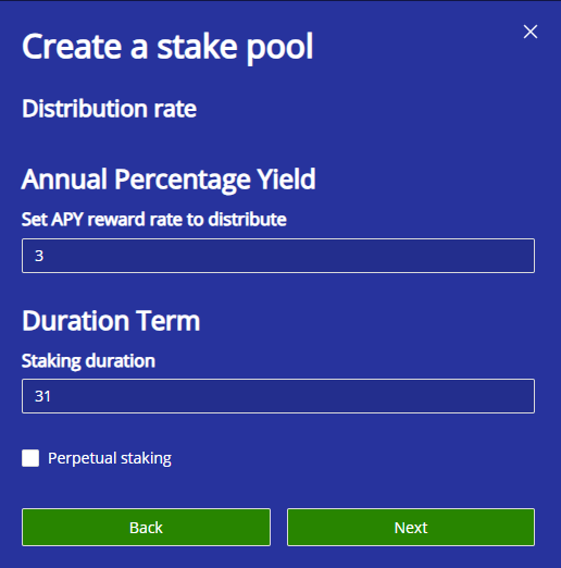 Included in the above menu is the option for *'Perpetual Staking'.* This means that there is no minimum staking duration, and users can choose to unstake the assets at any time, earning the equivalent return from how many days they left staked, essentially allowing users to decide the Staking duration.