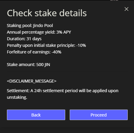 Finally, the user can review the details of their stake, as well as be shown any disclaimer message that was included in the initial setup.