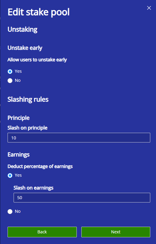 **Slash on Principle** - This is the percentage taken from the total amount of the initial staked asset. For example, if this is set to 5%, a user unstaking earlier, who staked 1000USDT, would receive back 950USDT, and the source wallet that is chosen would receive the 50USDT.