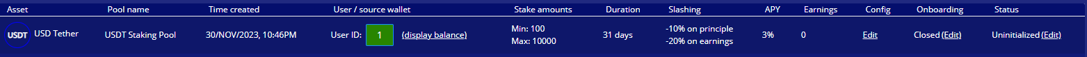 **Slash on Earnings** - This refers to the percentage taken of the earnings that a user has added to their stake until that point. For example, if a user had earned 5USDT up to a point, and had chosen unstake earlier than the full staking duration, if the Slash on Earnings was set to 50%, they would receive 2.5USDT (plus their initial stake minus any Slash on Principle %), and the pools source wallet would receive the other 2.5USDT