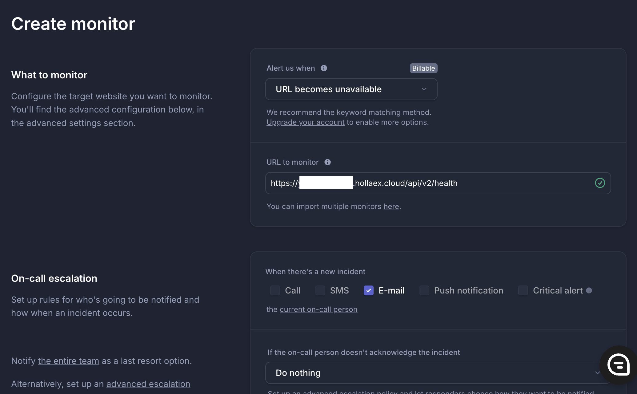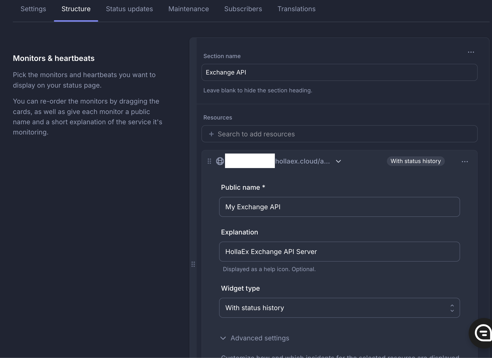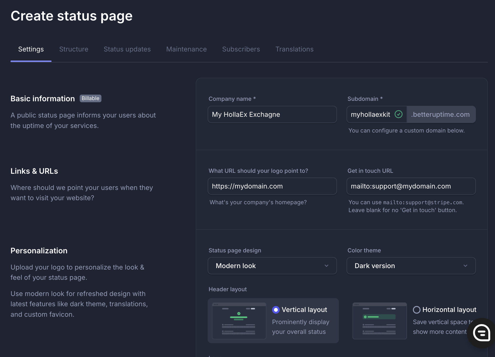 Better Stack offers a nice Status Page feature alongside the HTTP health checker. It has a [free tier](https://betterstack.com/pricing), which is a great way to get onboarded. It's a service that [status.hollaex.com](https://status.hollaex.com/) uses too.