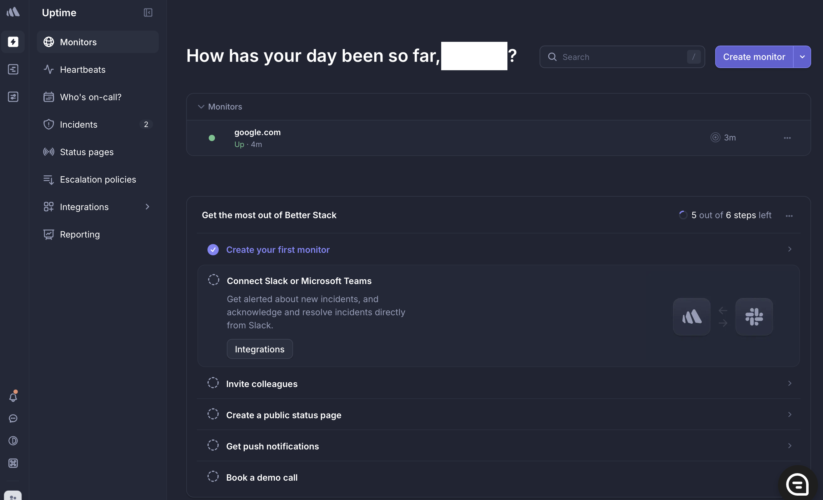 Select "Slack" or similar if you also want to use Better Stack as an active HTTP health checker and get downtime notifications. But it's okay to skip if you only need a simple Status Page.
